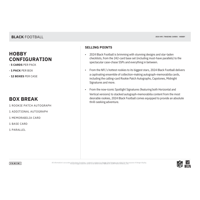 - From the NFL’s hottest rookies to its biggest stars, 2024 Black Football delivers a captivating ensemble of collection-making autograph-memorabilia cards, including the calling-card Rookie Patch Autographs, Capstones, Midnight Signatures and more.