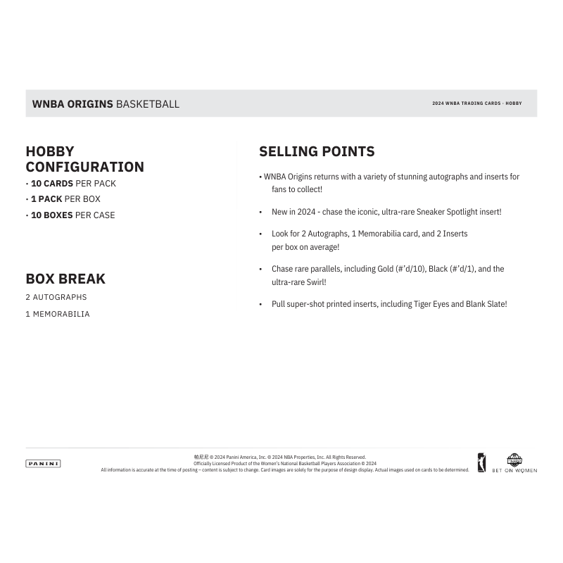 - Find autographs, jumbo memorabilia and stunning insert content throughout WNBA Origins!