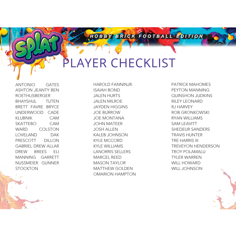 The 2025 Wild Card Splat Football Breakers Brick brings a bold and creative twist to football card collecting, designed with breakers and group openings in mind. Known for its eye-catching splatter art designs and unique packaging, this product delivers a mix of rookies, stars, and exclusive inserts that stand out from traditional releases. Each brick offers collectors the thrill of chasing limited parallels, autographs, and special variations that make Wild Card a fan-favorite for its originality and excitement. With its vibrant style and strong rookie presence, the 2025 Splat Football Breakers Brick is a must-have for breakers and collectors looking for something fresh and dynamic.